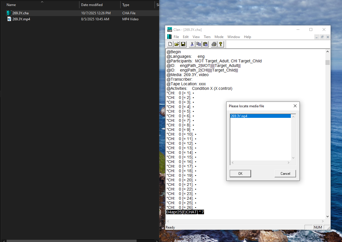 >>> I’m having trouble syncing a media file with my .cha file. I’ve attached a screenshot of the issue. I created a folder with the media name and added both the .cha file and the media file to that folder. When I select the media file, it still gives me an error asking me to move the media file.