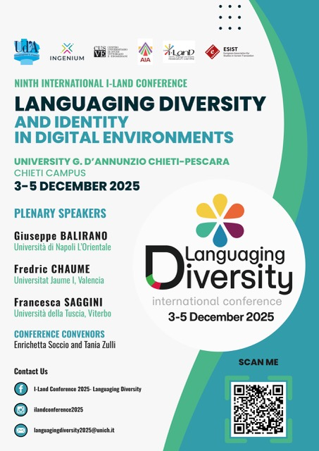 The programme includes keynote lectures by Frederic Chaume<https://www.unich.it/sites/default/files/2025-07/Chaume_ABSTRACT.pdf> (Universitat Jaume I, Spain), Giuseppe Balirano<https://www.unich.it/sites/default/files/2025-07/Balirano_ABSTRACT.pdf> (University of Naples L'Orientale), and Francesca Saggini<https://www.unich.it/sites/default/files/2025-07/Saggini_ABSTRACT.pdf> (University of Tuscia), as well as a rich selection of panels on online identity, diversity and inclusion in digital media, digital storytelling, and techno-linguistic biases.
