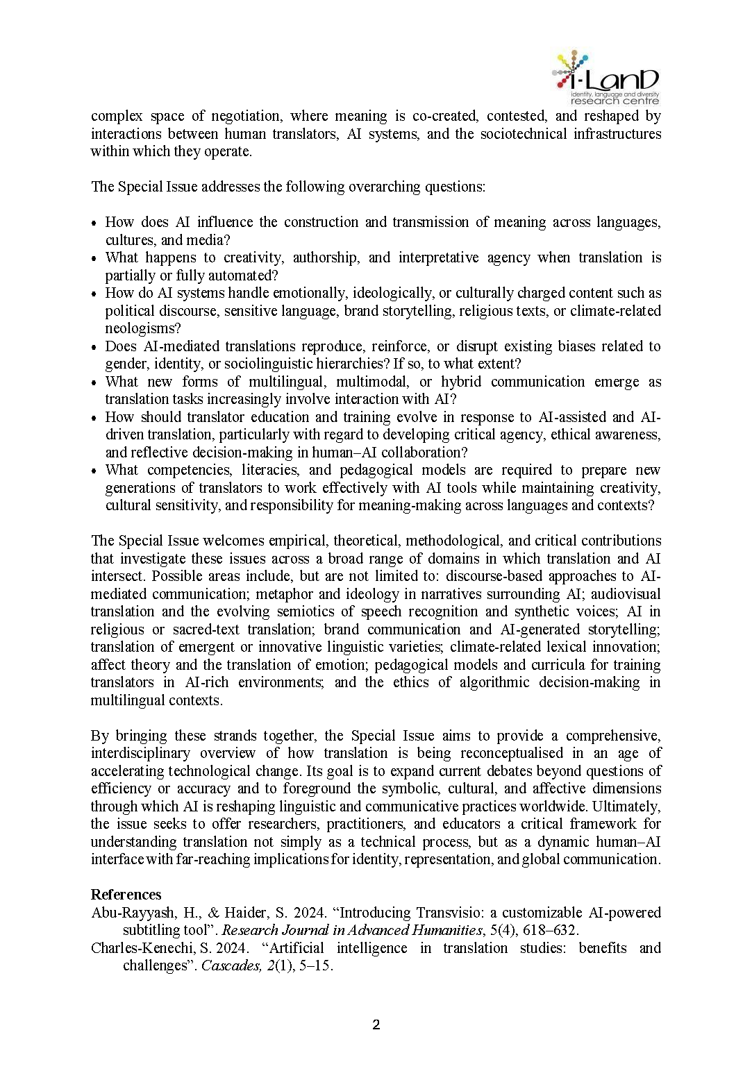 [I-LanD Research Centre] Call for Papers I-LanD Journal - Special Issue (2027, n. 1): "Translation at a Crossroad: AI, Language, and Identity"