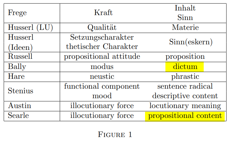 I just found an interesting paper by Per Martin-Löf “Are the objects of propositional attitudes propositions in the sense of propositional and predicate logic?” (2003<https://pml.flu.cas.cz/uploads/PML-Geneva19Dec03.pdf>) In this table, he compares Bally's contrast modus vs. dictum [actually from Aquinas] with proposals by other logicians and linguists: