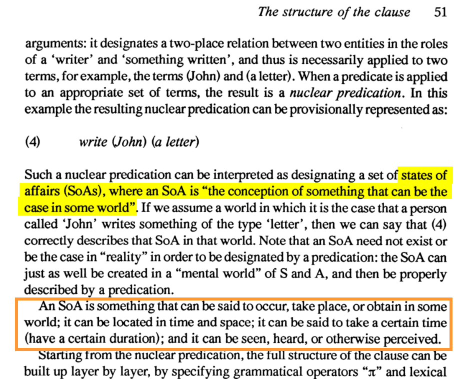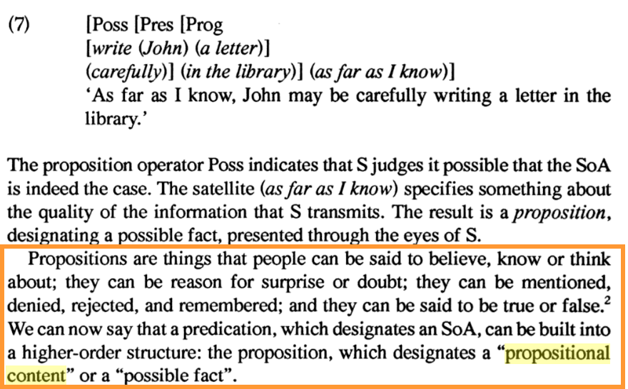 Dik carefully distinguishes between SoA, possible fact, predication, proposition, clause...