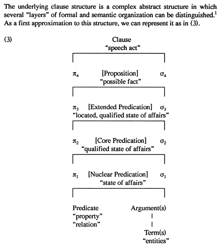 Interestingly, Dik describes one of his layers as “propositional content”, which he equates with “possible fact” (p.52):